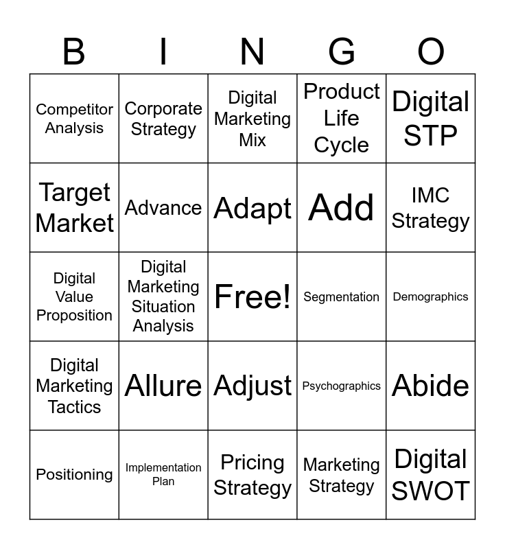 This bingo card has a free space and 28 words: Abide, Analyze, Add, Marketing Strategy, Target Market, Digital Marketing Mix, Corporate Strategy, Digital Marketing Tactics, Segmentation, Positioning, Digital Value Proposition, Product Life Cycle, Implementation Plan, Pricing Strategy, IMC Strategy, Digital Assets, Allure, Advance, Adapt, Adjust, Competitor Analysis, Marketing Objectives, Digital SWOT, Digital Marketing Situation Analysis, Demographics, Psychographics, Digital STP and Behavioral.