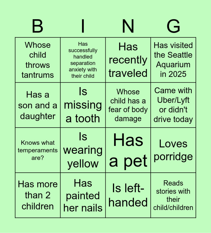 This bingo card has 16 words: Has more than 2 children, Has painted her nails, Has recently traveled, Has visited the Seattle Aquarium in 2025, Has a son and a daughter, Has successfully handled separation anxiety with their child, Has a pet, Loves porridge, Whose child throws tantrums, Is missing a tooth, Is left-handed, Came with Uber/Lyft or didn't drive today, Knows what temperaments are?, Is wearing yellow, Whose child has a fear of body damage and Reads stories with their child/children.