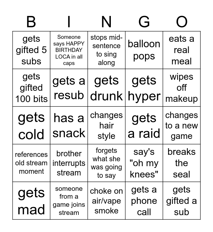 This bingo card has 42 words: You Love Loca, gets drunk, nose itches in the middle of a game, brother interrupts stream, gets a phone call, breaks the seal, changes hair style, gets jump scared in game, stops mid-sentence to sing along, forgets what she was going to say, changes to a new game, wipes off makeup, has a snack, eats a real meal, scolds the cats, say's "oh my knees", say's "oh my legs", gets cold, gets hot, Someone says HAPPY BIRTHDAY LOCA in all caps, gets gifted 100 bits, gets gifted 500 bits, gets gifted a sub, gets gifted 5 subs, yawns, gets sleepy, gets hyper, mentions WWE outside of daily wrestler redeem, yells at Solo, Talks about Nell selling, says "I sold", references old stream moment, gets a resub, choke on air/vape smoke, cries, gets mad, someone from a game joins stream, gets a raid, CREW member joins chat, bot gets blocked/banned from chat, balloon pops and can't find something she's looking for.