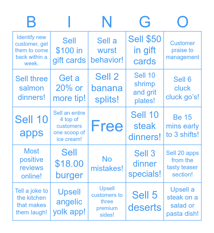 This bingo card has a free space and 24 words: Sell $18.00 burger, Upsell angelic yolk app!, Sell 2 banana splits!, Tell a joke to the kitchen that makes them laugh!, Customer praise to management, Identify new customer, get them to come back within a week., Sell three salmon dinners!, Sell $100 in gift cards, Sell 10 steak dinners!, No mistakes!, Sell 10 shrimp and grit plates!, Sell 10 apps, Sell 3 dinner specials!, Sell 20 apps from the tasty teaser section!, Get a 20% or more tip!, Sell 5 deserts, Be 15 mins early to 3 shifts!, Sell a wurst behavior!, Sell 6 cluck cluck go’s!, Sell an entire 4 top of customers one scoop of ice cream!, Upsell a steak on a salad or pasta dish!, Most positive reviews online!, Sell $50 in gift cards and Upsell customers to three premium sides!.