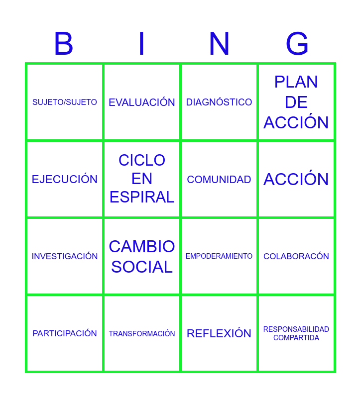 This bingo card has 16 words: PARTICIPACIÓN, TRANSFORMACIÓN, DIAGNÓSTICO, PLAN DE ACCIÓN, EJECUCIÓN, EVALUACIÓN, EMPODERAMIENTO, COLABORACÓN, SUJETO/SUJETO, CICLO EN ESPIRAL, REFLEXIÓN, ACCIÓN, INVESTIGACIÓN, CAMBIO SOCIAL, COMUNIDAD and RESPONSABILIDAD COMPARTIDA.