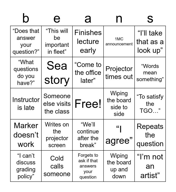 This bingo card has a free space and 32 words: Wiping the board up and down, “I didn’t get a chance to look at the homework yet”, Someone else visits the class, Can’t log into the computer, Marker doesn’t work, Sea story, “I’ll take that as a look up”, Repeats the question, “This will be important in fleet”, “You guys are quiet”, “Come to the office later”, Finishes lecture early, “This is the most difficult problem that you’ll see”, “When I took this class I got a ___”, Wiping the board side to side, “We do this for [insert future class here]”, “I can’t discuss grading policy”, Instructor is late, “We’ll continue after the break”, Writes on the projector screen, “I agree”, “You need to know this verbatim”, “To satisfy the TGO…”, Cold calls someone, “I’m not an artist”, 1MC announcement, Projector times out, “What questions do you have?”, “Does that answer your question?”, Forgets to ask if that answers your question, “You don’t need to know that” and “Words mean something”.