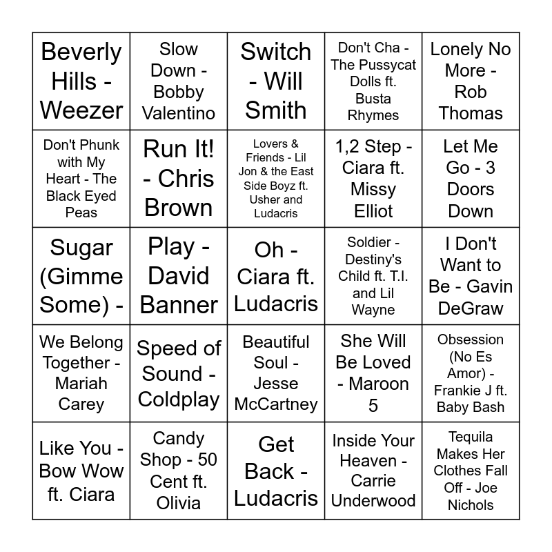 This bingo card has 61 words: Let Me Love You - Mario, Candy Shop - 50 Cent ft. Olivia, Hollaback Girl - Gwen Stefani, We Belong Together - Mariah Carey, Inside Your Heaven - Carrie Underwood, Gold Digger - Kanye West ft. Jamie Foxx, Run It! - Chris Brown, Since U Been Gone - Kelly Clarkson, 1,2 Step - Ciara ft. Missy Elliot, Boulevard of Broken Dreams - Green Day, Don't Cha - The Pussycat Dolls ft. Busta Rhymes, You and Me - Lifehouse, Don't Phunk with My Heart - The Black Eyed Peas, Mr. Brightside - The Killers, How We Do - The Game ft. 50 Cent, Beverly Hills - Weezer, Oh - Ciara ft. Ludacris, Lonely No More - Rob Thomas, Drop It Like It's Hot - Snoop Dogg ft. Pharrell, Lovers & Friends - Lil Jon & the East Side Boyz ft. Usher and Ludacris, Soldier - Destiny's Child ft. T.I. and Lil Wayne, Switch - Will Smith, Like You - Bow Wow ft. Ciara, Obsession (No Es Amor) - Frankie J ft. Baby Bash, Caught Up - Usher, Listen to Your Heart - DHT ft. Edmee, Scars - Papa Roach, Feel Good Inc. - Gorillaz, Let Me Go - 3 Doors Down, Sugar, We're Goin Down - Fall Out Boy, Grind with Me - Pretty Ricky, Photograph - Nickelback, Lonely - Akon, Collide - Howie Day, Slow Down - Bobby Valentino, Over and Over - Nelly ft. Tim McGraw, Get It Poppin - Fat Joe ft. Nelly, Play - David Banner, Soul Survivor - Young Jeezy ft. Akon, Sugar (Gimme Some) -, Karma - Alicia, Speed of Sound - Coldplay, I Don't Want to Be - Gavin DeGraw, Mockingbird - Eminem, She Will Be Loved - Maroon 5, Wait (The Whisper Song) - Ying Yang Twins, Incomplete - Backstreet Boys, Best of You - Foo Fighters, Goin' Crazy - Natalie, Beautiful Soul - Jesse McCartney, Get Back - Ludacris, These Words - Natasha Bedingfield, Get Right - Jennefer Lopez, As Good as I Once Was - Toby Keith, We Be Burnin - Sean Paul, True - Ryan Cabrera, Just the Girl - The Click Five, Mississippi Girl - Faith Hill, Must Be Doin' Someghin' Right - Billy Currington, Tequila Makes Her Clothes Fall Off - Joe Nichols and Not Now - Blink-182.