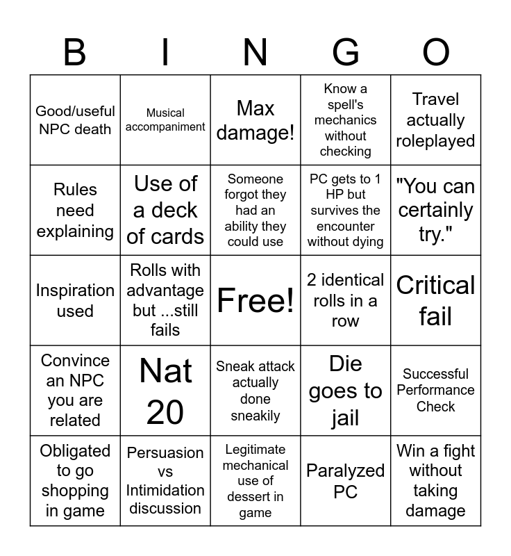 This bingo card has a free space and 24 words: Nat 20, Persuasion vs Intimidation discussion, Someone forgot they had an ability they could use, Obligated to go shopping in game, Travel actually roleplayed, Good/useful NPC death, Rules need explaining, Musical accompaniment, 2 identical rolls in a row, Sneak attack actually done sneakily, PC gets to 1 HP but survives the encounter without dying, Inspiration used, Die goes to jail, Successful Performance Check, Use of a deck of cards, Paralyzed PC, Critical fail, Max damage!, "You can certainly try.", Rolls with advantage but ...still fails, Win a fight without taking damage, Convince an NPC you are related, Know a spell's mechanics without checking and Legitimate mechanical use of dessert in game.