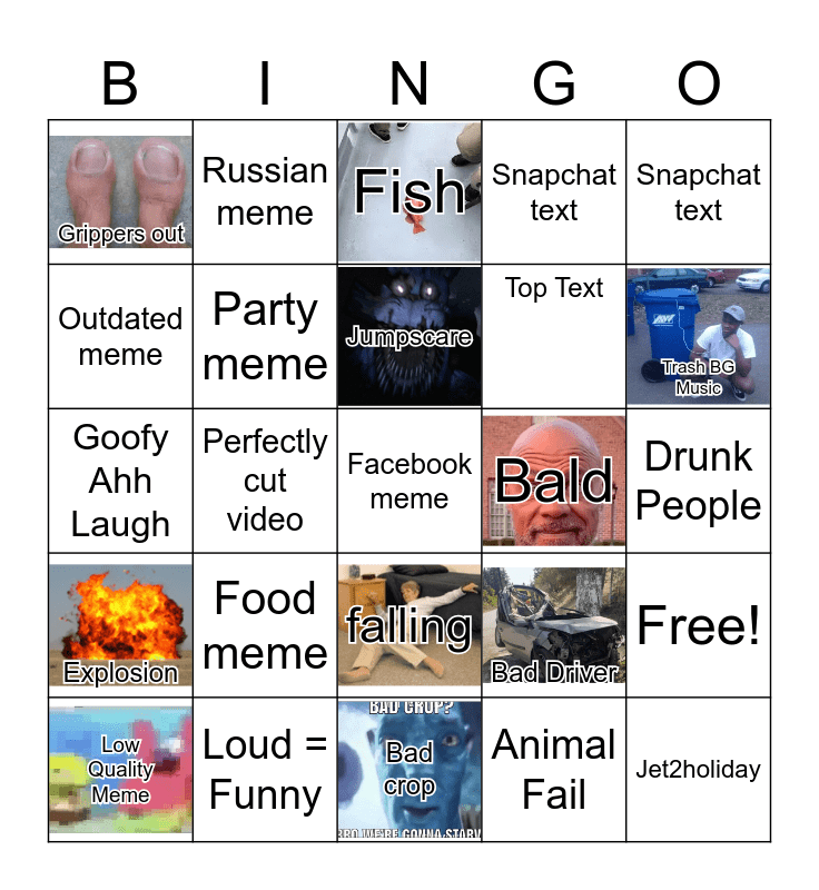 This bingo card has 11 images and 26 words: falling, Animal Fail, Jumpscare, Loud = Funny, Snapchat text, Grippers out, Outdated meme, Russian meme, Drunk People, Bad Driver, Top Text, Goofy Ahh Laugh, Free!, Low Quality Meme, Perfectly cut video, Glass break, Snapchat text, Explosion, Fish, Facebook meme, Trash BG Music, Bad crop, Bald, Food meme, Party meme and Jet2holiday.