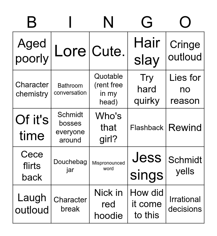 This bingo card has a free space and 24 words: Douchebag jar, Character break, Quotable (rent free in my head), Laugh outloud, Cringe outloud, Aged poorly, Character chemistry, Lore, Flashback, Mispronounced word, Try hard quirky, Of it's time, Jess sings, Schmidt yells, Bathroom conversation, How did it come to this, Rewind, Cute., Lies for no reason, Schmidt bosses everyone around, Irrational decisions, Cece flirts back, Hair slay and Nick in red hoodie.