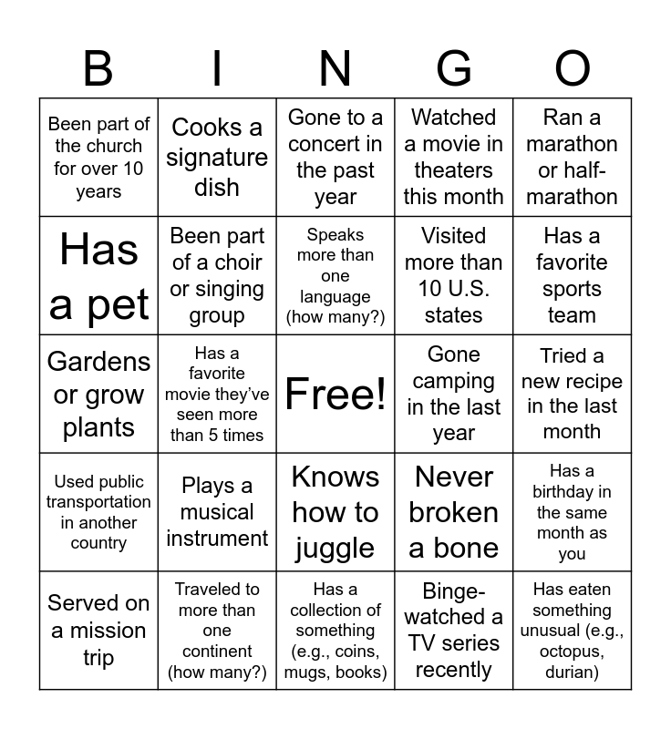 This bingo card has a free space and 24 words: Plays a musical instrument, Traveled to more than one continent (how many?), Speaks more than one language (how many?), Served on a mission trip, Ran a marathon or half-marathon, Been part of the church for over 10 years, Has a pet, Cooks a signature dish, Gone camping in the last year, Knows how to juggle, Visited more than 10 U.S. states, Gardens or grow plants, Never broken a bone, Has a birthday in the same month as you, Been part of a choir or singing group, Binge-watched a TV series recently, Tried a new recipe in the last month, Gone to a concert in the past year, Has a favorite sports team, Has a favorite movie they’ve seen more than 5 times, Has eaten something unusual (e.g., octopus, durian), Used public transportation in another country, Watched a movie in theaters this month and Has a collection of something (e.g., coins, mugs, books).