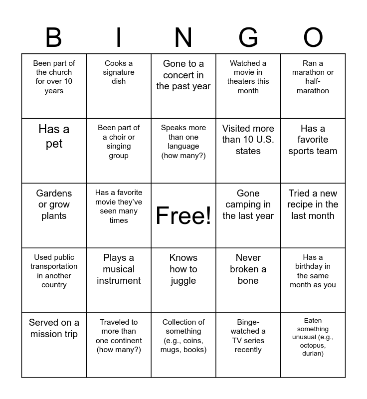 This bingo card has a free space and 24 words: Plays a musical instrument, Traveled to more than one continent (how many?), Speaks more than one language (how many?), Served on a mission trip, Ran a marathon or half-marathon, Been part of the church for over 10 years, Has a pet, Cooks a signature dish, Gone camping in the last year, Knows how to juggle, Visited more than 10 U.S. states, Gardens or grow plants, Never broken a bone, Has a birthday in the same month as you, Been part of a choir or singing group, Binge-watched a TV series recently, Tried a new recipe in the last month, Gone to a concert in the past year, Has a favorite sports team, Has a favorite movie they’ve seen many times, Eaten something unusual (e.g., octopus, durian), Used public transportation in another country, Watched a movie in theaters this month and Collection of something (e.g., coins, mugs, books).