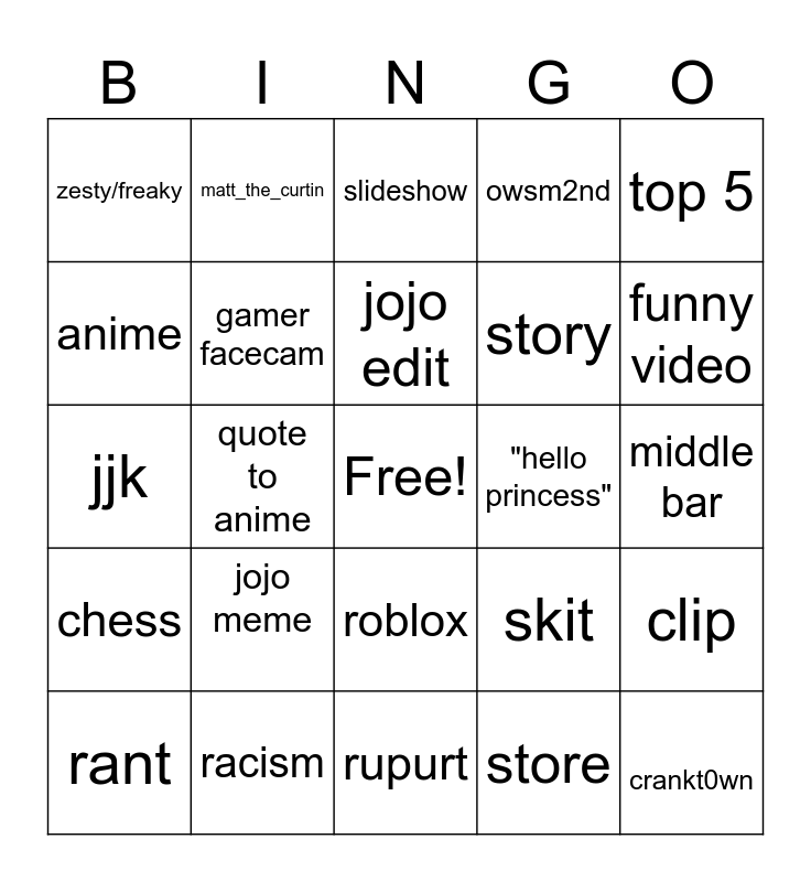 This bingo card has a free space and 24 words: jojo meme, racism, jojo edit, rant, top 5, zesty/freaky, anime, matt_the_curtin, "hello princess", roblox, story, jjk, skit, clip, gamer facecam, store, middle bar, slideshow, funny video, quote to anime, crankt0wn, chess, owsm2nd and rupurt.