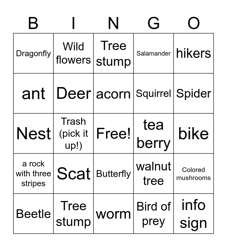 This bingo card has a free space and 24 words: Scat, Tree stump, acorn, Beetle, hikers, Dragonfly, ant, Wild flowers, tea berry, Butterfly, Squirrel, Nest, walnut tree, Colored mushrooms, Deer, Bird of prey, bike, Tree stump, Spider, Trash (pick it up!), info sign, a rock with three stripes, Salamander and worm.