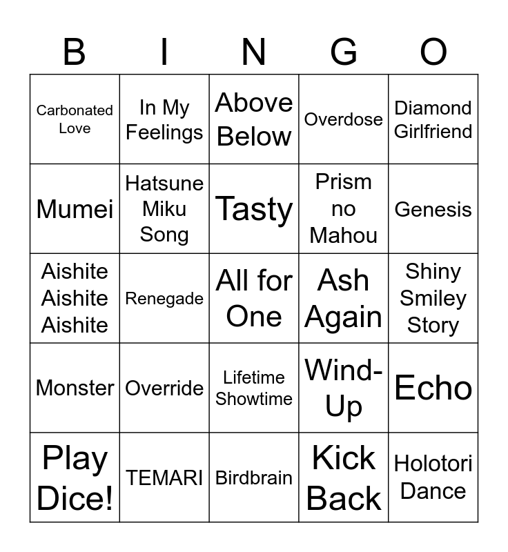 This bingo card has a free space and 24 words: Override, TEMARI, Tasty, Play Dice!, Diamond Girlfriend, Carbonated Love, Mumei, In My Feelings, Ash Again, Lifetime Showtime, Prism no Mahou, Aishite Aishite Aishite, Wind-Up, Echo, Hatsune Miku Song, Kick Back, Shiny Smiley Story, Above Below, Genesis, Renegade, Holotori Dance, Monster, Overdose and Birdbrain.