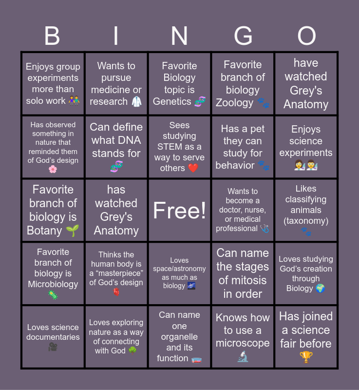 This bingo card has a free space and 28 words: Loves studying God’s creation through Biology 🌍, Dreams of using Biology to help others 🙌, Has a pet they can study for behavior 🐾, Knows how to use a microscope 🔬, Has observed something in nature that reminded them of God’s design 🌸, Favorite Biology topic is Genetics 🧬, Wants to pursue medicine or research 🥼, Favorite branch of biology is Microbiology🦠, Wants to become a doctor, nurse, or medical professional 🩺, Loves science documentaries 🎥, Favorite branch of biology is Botany 🌱, Favorite branch of biology Zoology 🐾, Loves exploring nature as a way of connecting with God 🌳, Can name one organelle and its function 🧫, Enjoys science experiments 👩🔬👨🔬, Knows one fun fact about the human body 🫀, Thinks the human body is a “masterpiece” of God’s design 🫀, Can define what DNA stands for 🧬, Sees studying STEM as a way to serve others ❤️, Loves space/astronomy as much as biology 🌌, Enjoys group experiments more than solo work 👫, Has grown a plant for a project 🌱, Has joined a science fair before 🏆, has watched Grey's Anatomy, Likes classifying animals (taxonomy) 🐾, Can name the stages of mitosis in order, have watched Grey's Anatomy and Thinks physics or chemistry helps explain biology.
