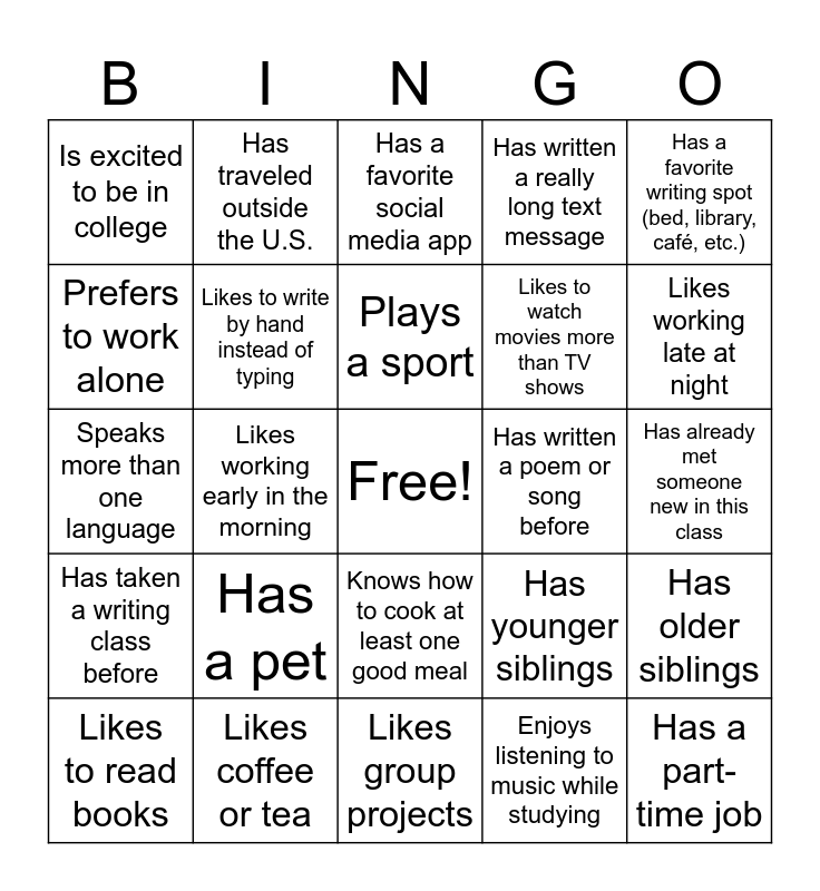 This bingo card has a free space and 24 words: Has a pet, Likes coffee or tea, Plays a sport, Likes to read books, Has a favorite writing spot (bed, library, café, etc.), Is excited to be in college, Prefers to work alone, Has traveled outside the U.S., Has written a poem or song before, Knows how to cook at least one good meal, Likes to watch movies more than TV shows, Speaks more than one language, Has younger siblings, Has older siblings, Likes to write by hand instead of typing, Enjoys listening to music while studying, Has already met someone new in this class, Has a favorite social media app, Likes working late at night, Likes working early in the morning, Has a part-time job, Has taken a writing class before, Has written a really long text message and Likes group projects.