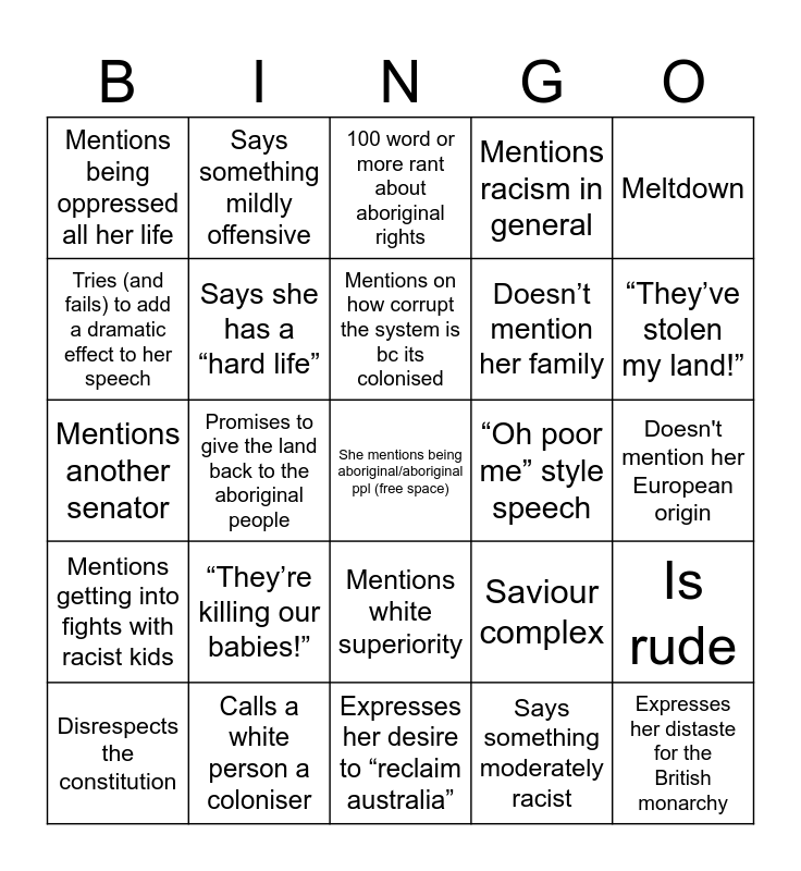 This bingo card has a free space and 24 words: “They’re killing our babies!”, Calls a white person a coloniser, Mentions on how corrupt the system is bc its colonised, Disrespects the constitution, Meltdown, Mentions being oppressed all her life, Tries (and fails) to add a dramatic effect to her speech, Says something mildly offensive, “Oh poor me” style speech, Mentions white superiority, Doesn’t mention her family, Mentions another senator, Saviour complex, Is rude, Says she has a “hard life”, Says something moderately racist, Doesn't mention her European origin, 100 word or more rant about aboriginal rights, “They’ve stolen my land!”, Promises to give the land back to the aboriginal people, Expresses her distaste for the British monarchy, Mentions getting into fights with racist kids, Mentions racism in general and Expresses her desire to “reclaim australia”.