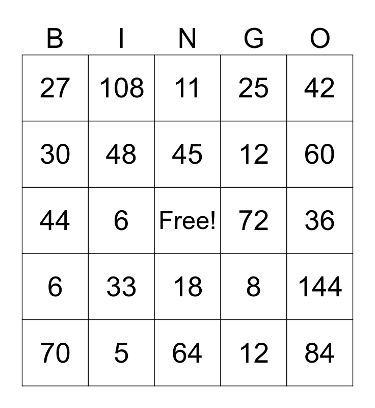 This bingo card has a free space and 79 words: 9, 10, 11, 12, 14, 15, 16, 18, 20, 21, 22, 24, 25, 27, 28, 30, 32, 33, 35, 36, 40, 42, 44, 45, 48, 49, 50, 54, 55, 56, 60, 63, 64, 66, 70, 72, 77, 80, 81, 84, 88, 90, 96, 99, 100, 108, 110, 120, 121, 132, 144, 6, 8, 4, 12, 18, 24, 24, 8, 18, 12, 4, 9, 16, 36, 3, 10, 8, 7, 6, 5, 4, 3, 2, 1, 12, 14, 36 and 24.