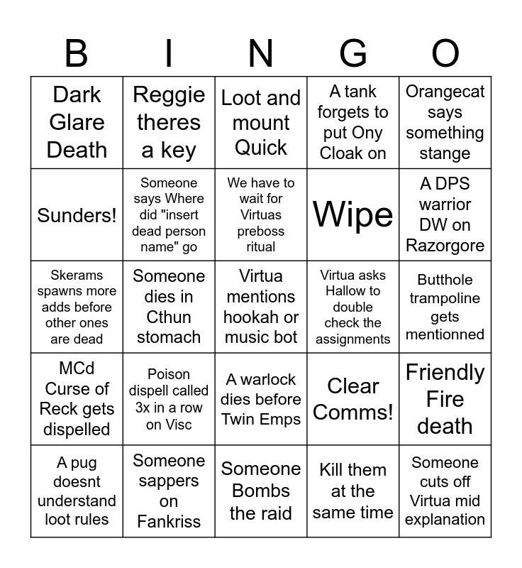 This bingo card has a free space and 24 words: Poison dispell called 3x in a row on Visc, Someone sappers on Fankriss, We have to wait for Virtuas preboss ritual, A pug doesnt understand loot rules, Orangecat says something stange, Dark Glare Death, Sunders!, Reggie theres a key, Virtua asks Hallow to double check the assignments, A warlock dies before Twin Emps, Wipe, Skerams spawns more adds before other ones are dead, Clear Comms!, Friendly Fire death, Someone says Where did "insert dead person name" go, Kill them at the same time, Butthole trampoline gets mentionned, Loot and mount Quick, A DPS warrior DW on Razorgore, Someone dies in Cthun stomach, Someone cuts off Virtua mid explanation, MCd Curse of Reck gets dispelled, A tank forgets to put Ony Cloak on and Someone Bombs the raid.