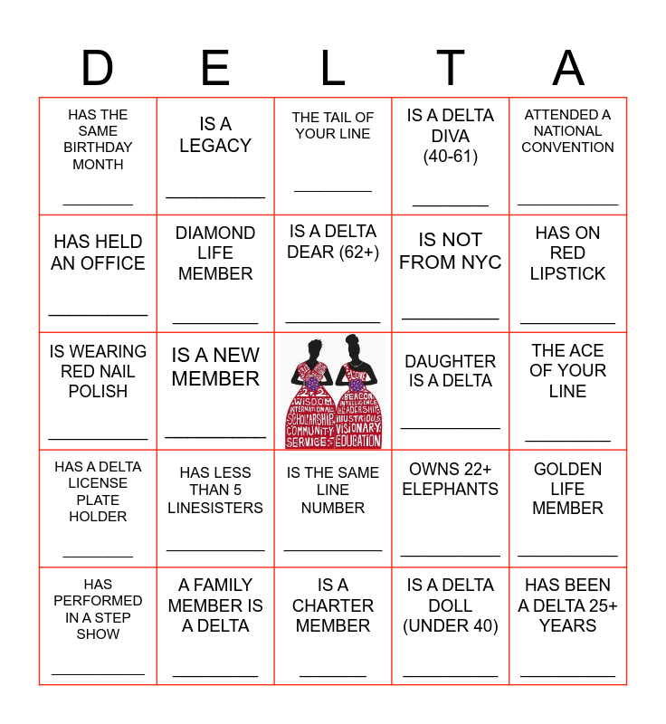 This bingo card has a free space and 24 words: HAS LESS THAN 5 LINESISTERS ____________, A FAMILY MEMBER IS A DELTA _________, IS A DELTA DEAR (62+) __________, HAS PERFORMED IN A STEP SHOW ____________, ATTENDED A NATIONAL CONVENTION _____________, HAS THE SAME BIRTHDAY MONTH _________, HAS HELD AN OFFICE __________, IS A LEGACY __________, DAUGHTER IS A DELTA ___________, IS THE SAME LINE NUMBER ____________, IS NOT FROM NYC _________, IS WEARING RED NAIL POLISH ___________, OWNS 22+ ELEPHANTS ___________, GOLDEN LIFE MEMBER ___________, DIAMOND LIFE MEMBER _________, IS A DELTA DOLL (UNDER 40) __________, THE ACE OF YOUR LINE _________, THE TAIL OF YOUR LINE __________, HAS ON RED LIPSTICK __________, IS A NEW MEMBER _________, HAS BEEN A DELTA 25+ YEARS __________, HAS A DELTA LICENSE PLATE HOLDER _________, IS A DELTA DIVA (40-61) ________ and IS A CHARTER MEMBER _______.