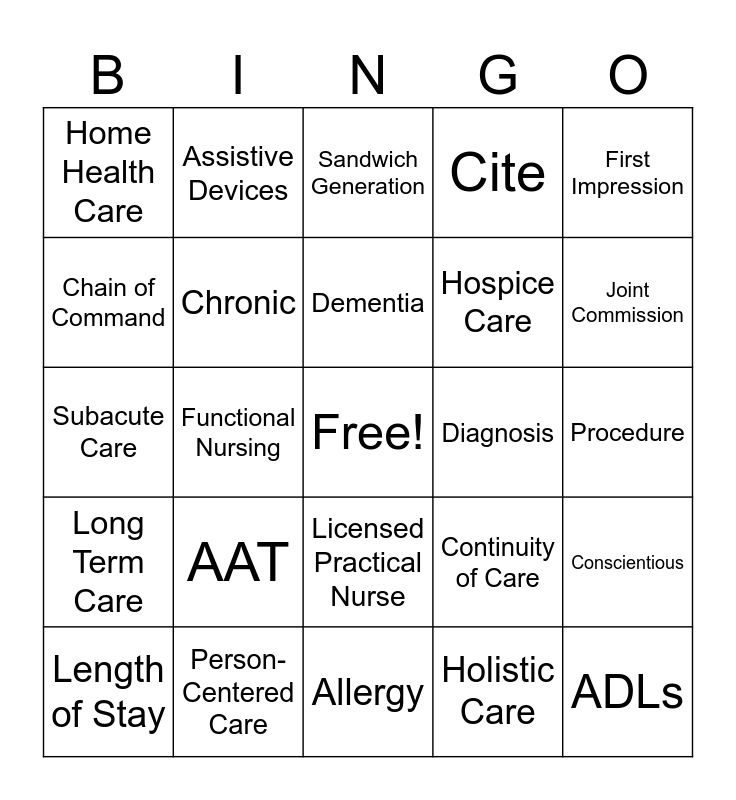 This bingo card has a free space and 48 words: Accountable, ADLs, Acute Care, Allergy, AAT, Assisted Living, Assistive Devices, Care Team, Chain of Command, Charge Nurse, Chronic, Cite, Conscientious, Continuity of Care, Courteous, Delegation, Dementia, Diagnosis, Empathetic, First Impression, Functional Nursing, Holistic Care, Home Health Care, Hospice Care, Intergenerational Care, Joint Commission, Length of Stay, Liability, Licensed Practical Nurse, Long Term Care, Medicaid, Medicare, Nursing Assistant, Outpatient Care, Person-Centered Care, Policy, Primary Nursing, Procedure, Professionalism, Registered Nurse, Rehabilitation, Resident, Sandwich Generation, Skilled Care, Subacute Care, Team Leader, Team Nursing and Trustworthy.