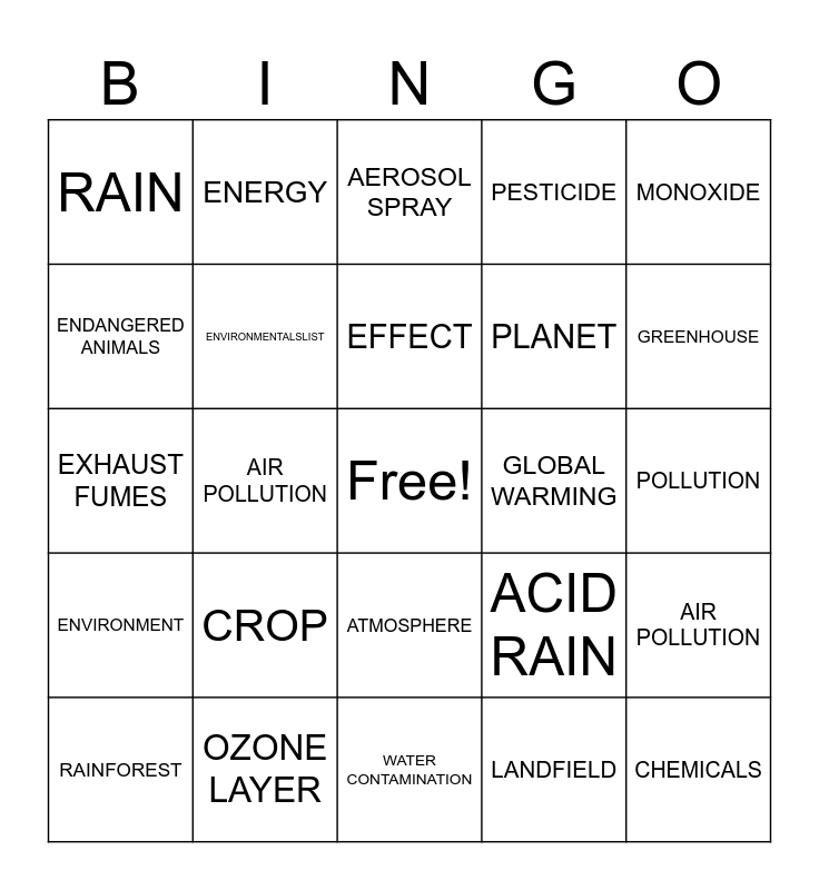 This bingo card has a free space and 27 words: ACID RAIN, DEFORESTATION, PLANET, WATER CONTAMINATION, ENDANGERED ANIMALS, AEROSOL SPRAY, ENERGY, ENVIRONMENT, GLOBAL WARMING, AIR POLLUTION, EXHAUST FUMES, PESTICIDE, RAINFOREST, OZONE LAYER, GREENHOUSE, RECYCLE, ENVIRONMENTALSLIST, EFFECT, CROP, RAIN, POLLUTION, LANDFIELD, AIR POLLUTION, CHEMICALS, ATMOSPHERE, MONOXIDE and SOURCE.