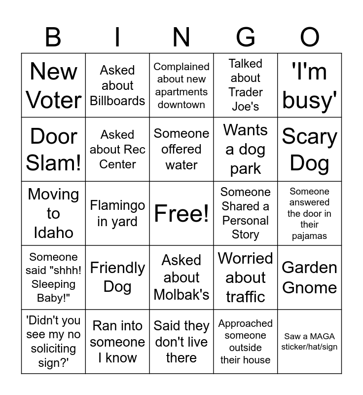 This bingo card has a free space and 24 words: Friendly Dog, Ran into someone I know, Someone offered water, 'Didn't you see my no soliciting sign?', 'I'm busy', New Voter, Door Slam!, Asked about Billboards, Someone Shared a Personal Story, Asked about Molbak's, Wants a dog park, Moving to Idaho, Worried about traffic, Garden Gnome, Asked about Rec Center, Approached someone outside their house, Someone answered the door in their pajamas, Complained about new apartments downtown, Scary Dog, Flamingo in yard, Saw a MAGA sticker/hat/sign, Someone said "shhh! Sleeping Baby!", Talked about Trader Joe's and Said they don't live there.