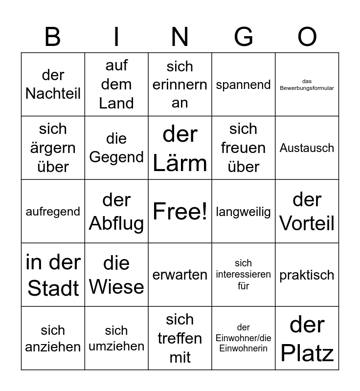 This bingo card has a free space and 27 words: sich interessieren für, sich freuen auf, sich freuen über, sich treffen mit, sich ärgern über, sich erinnern an, auf dem Land, in der Stadt, langweilig, praktisch, aufregend, spannend, sich anziehen, sich umziehen, Austausch, im Ausland fahren, die Gegend, der Lärm, die Wiese, der Nachteil, der Vorteil, der Einwohner/die Einwohnerin, der Abflug, der Platz, erwarten, das Bewerbungsformular and der Umzug.