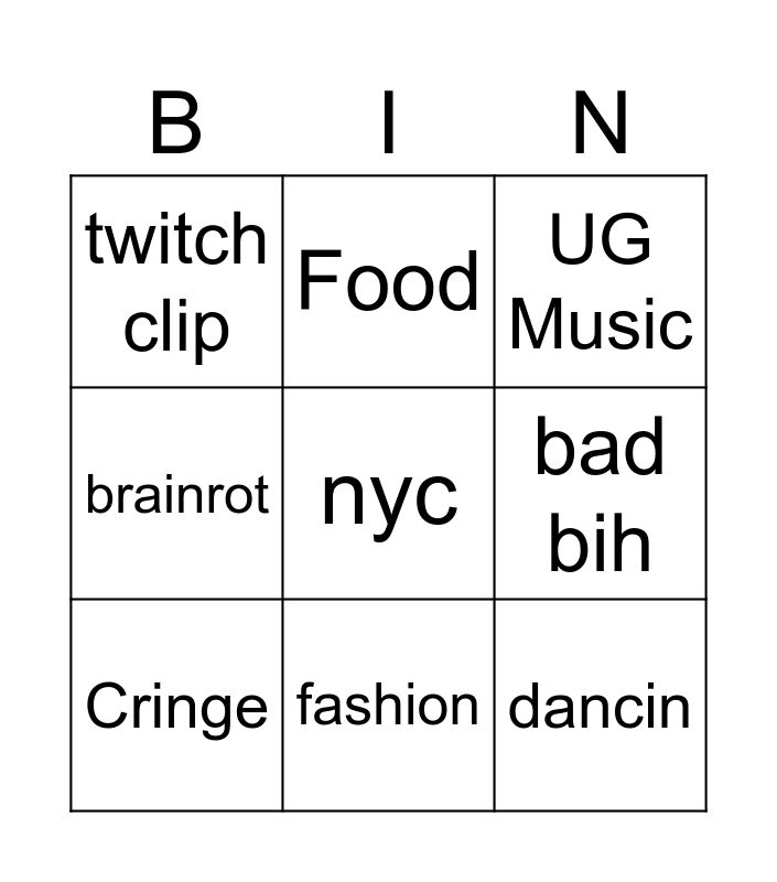 This bingo card has a free space and 8 words: bad bih, UG Music, Food, Cringe, twitch clip, dancin, brainrot and fashion.