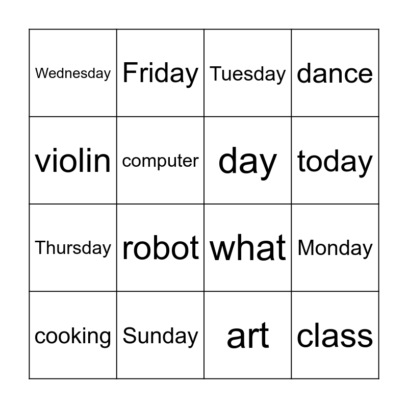 This bingo card has 16 words: Sunday, Monday, Tuesday, Wednesday, Thursday, Friday, what, art, violin, computer, cooking, dance, robot, today, day and class.