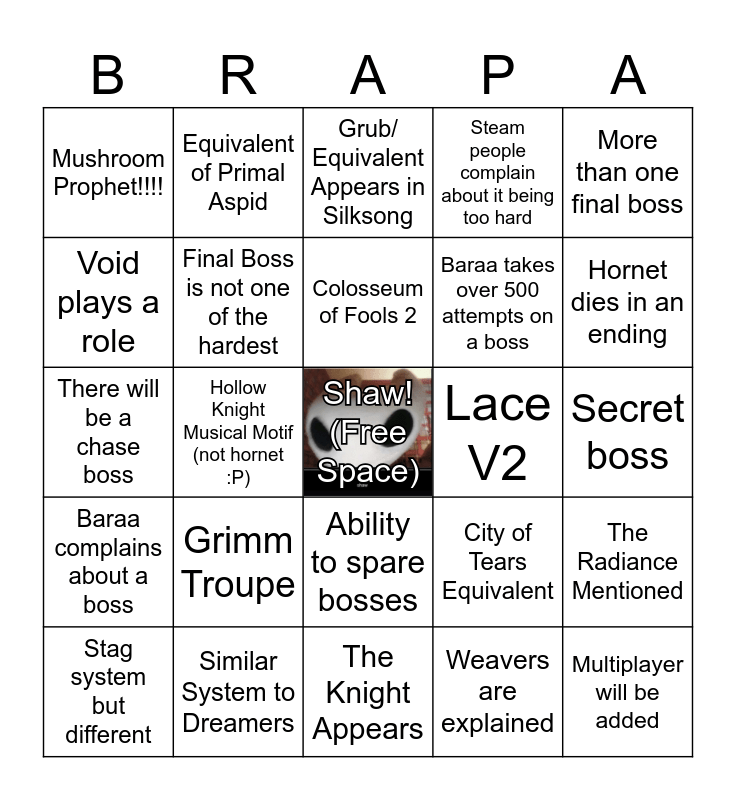 This bingo card has a free space and 24 words: Grimm Troupe, Similar System to Dreamers, Colosseum of Fools 2, Stag system but different, More than one final boss, Mushroom Prophet!!!!, Void plays a role, Equivalent of Primal Aspid, Lace V2, Ability to spare bosses, Baraa takes over 500 attempts on a boss, There will be a chase boss, City of Tears Equivalent, The Radiance Mentioned, Final Boss is not one of the hardest, Weavers are explained, Secret boss, Grub/ Equivalent Appears in Silksong, Hornet dies in an ending, Hollow Knight Musical Motif (not hornet :P), Multiplayer will be added, Baraa complains about a boss, Steam people complain about it being too hard and The Knight Appears.