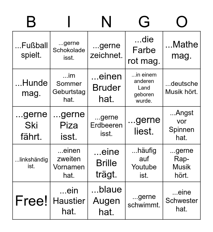 This bingo card has 29 words: Free!, ...dieselbe Schuhgröße hat., ...gerne Piza isst., ...eine Schwester hat., ...Fußball spielt., ...gerne zeichnet., ...im Sommer Geburtstag hat., ...einen zweiten Vornamen hat., ...gerne liest., ...ein Haustier hat., ...Angst vor Spinnen hat., ...gerne Erdbeeren isst., ...blaue Augen hat., ...gerne schwimmt., ...deutsche Musik hört., ...ein Instrument spielt., ...eine Brille trägt., ...linkshändig ist., ...Mathe mag., ...gerne Ski fährt., ...häufig auf Youtube ist., ...gerne Eis isst., ...in einem anderen Land geboren wurde., ...Hunde mag., ...die Farbe rot mag., ...gerne Schokolade isst., ...gerne Rap-Musik hört., ...einen Bruder hat. and ...gerne backt..