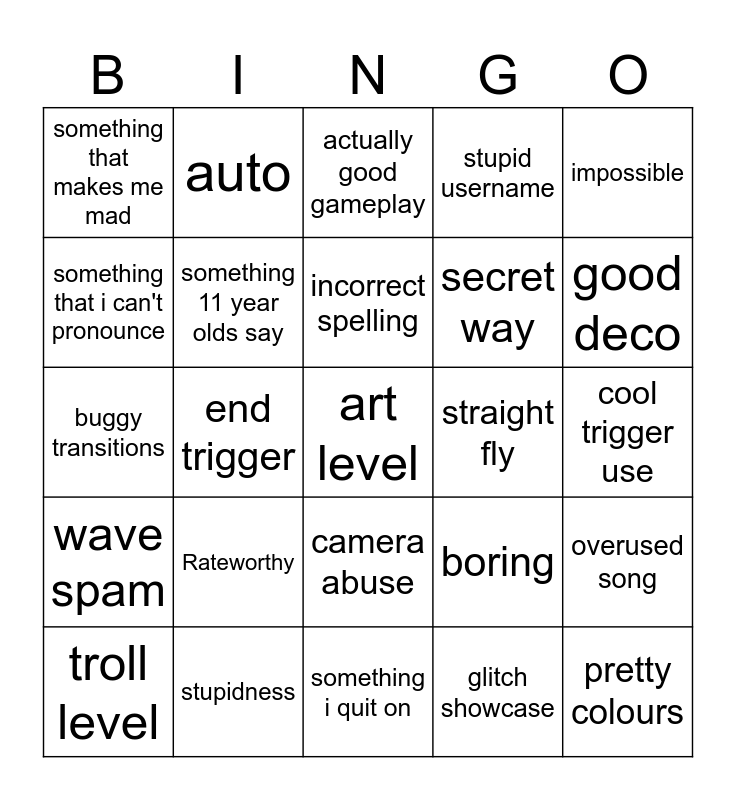 This bingo card has a free space and 24 words: Rateworthy, stupidness, incorrect spelling, troll level, impossible, something that makes me mad, something that i can't pronounce, auto, straight fly, camera abuse, secret way, buggy transitions, boring, overused song, something 11 year olds say, glitch showcase, cool trigger use, actually good gameplay, good deco, end trigger, pretty colours, wave spam, stupid username and something i quit on.