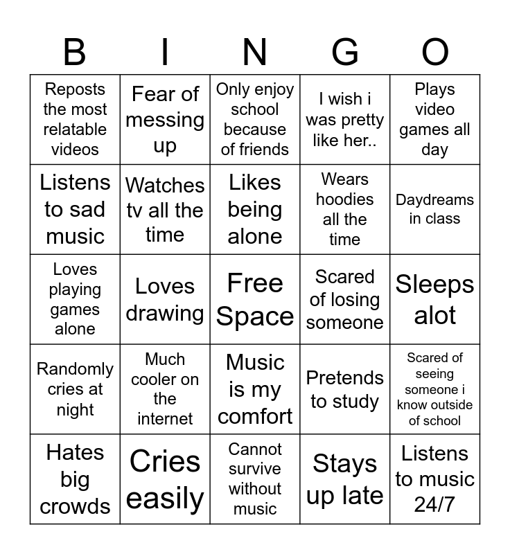 This bingo card has a free space and 24 words: Much cooler on the internet, Cries easily, Likes being alone, Hates big crowds, Plays video games all day, Reposts the most relatable videos, Listens to sad music, Fear of messing up, Scared of losing someone, Music is my comfort, Wears hoodies all the time, Loves playing games alone, Pretends to study, Scared of seeing someone i know outside of school, Watches tv all the time, Stays up late, Sleeps alot, Only enjoy school because of friends, Daydreams in class, Loves drawing, Listens to music 24/7, Randomly cries at night, I wish i was pretty like her.. and Cannot survive without music.