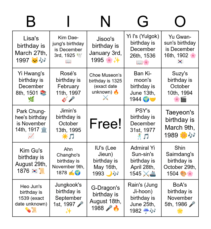 This bingo card has a free space and 30 words: Jungkook's birthday is September 1st, 1997 π€β¨, V's (Kim Taehyung) birthday is December 30th, 1995 ππΆ, Jimin's birthday is October 13th, 1995 βοΈπ΅, Jennie's birthday is January 16th, 1996 π€π, Lisa's birthday is March 27th, 1997 π±πΆ, Jisoo's birthday is January 3rd, 1995 πΈβ¨, RosΓ©'s birthday is February 11th, 1997 πΈπ€, IU's (Lee Jieun) birthday is May 16th, 1993 ππΆ, PSY's birthday is December 31st, 1977 πΊπ΅, G-Dragon's birthday is August 18th, 1988 π€π₯, Taeyeon's birthday is March 9th, 1989 πΌπΆ, BoA's birthday is November 5th, 1986 π€π, Rain's (Jung Ji-hoon) birthday is June 25th, 1982 βπΆ, Kang Daniel's birthday is December 10th, 1996 π±πΆ, Suzy's birthday is October 10th, 1994 πΈπ¬, King Sejong's birthday is May 15th, 1397 ππ, Admiral Yi Sun-sin's birthday is April 28th, 1545 βοΈπ’, Kim Gu's birthday is August 29th, 1876 π°π·π, Ahn Changho's birthday is November 9th, 1878 βοΈπ, Yu Gwan-sun's birthday is December 16th, 1902 πΈπ°π·, Park Chung-hee's birthday is November 14th, 1917 ποΈπ, Syngman Rhee's birthday is March 26th, 1875 ποΈπ, Kim Dae-jung's birthday is December 3rd, 1925 ποΈπ, Ban Ki-moon's birthday is June 13th, 1944 ππ€, Yi Hwang's birthday is December 8th, 1501 ππΏ, Yi I's (Yulgok) birthday is December 26th, 1536 ππΈ, Shin Saimdang's birthday is October 29th, 1504 π¨πΈ, Heo Jun's birthday is 1539 (exact date unknown) ππ, Choe Museonβs birthday is 1325 (exact date unknown) π₯βοΈ and Kim Hong-do's birthday is 1745 (exact date unknown) π¨π.