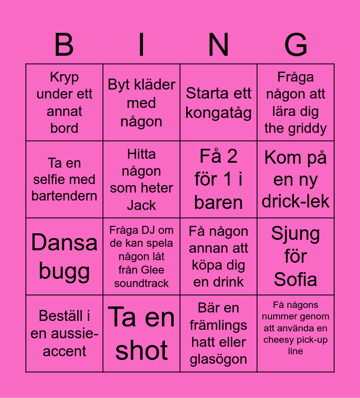 This bingo card has 16 words: Ta en shot, Sjung för Sofia, Starta ett kongatåg, Kryp under ett annat bord, Dansa bugg, Byt kläder med någon, Få någon annan att köpa dig en drink, Bär en främlings hatt eller glasögon, Ta en selfie med bartendern, Hitta någon som heter Jack, Beställ i en aussie-accent, Fråga någon att lära dig the griddy, Fråga DJ om de kan spela någon låt från Glee soundtrack, Kom på en ny drick-lek, Få 2 för 1 i baren and Få någons nummer genom att använda en cheesy pick-up line.