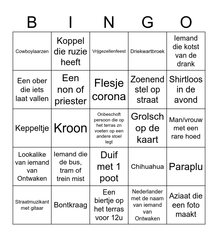 This bingo card has 42 words: Mondmasker, Flesje corona, Grote man met kleine hond, Iemand die de bus, tram of trein mist, Nederlander met de naam van iemand van Ontwaken, Paraplu, Onbeschoft persoon die op het terras zn voeten op een andere stoel legt, De bowlingbal (groep van 4+ kale mannen), Vrijgezellenfeest, Duif met 1 poot, Man/vrouw met een rare hoed, Shirtloos in de avond, Kroon, Iemand die kotst van de drank, Cactus, Chihuahua, Vrouw met kort geverft haar(bijv blauw/roze), Keppeltje, Bekend persoon, Koppel die ruzie heeft, Een ober die iets laat vallen, Hond die een muilkorf of kleding draagt, Aziaat die een foto maakt, Cowboylaarzen, Gids met een microfoon of stok met vlag, Koffer of tas met disneyfiguur, Zoenend stel op straat, Zonnebril in de nacht, Selfiestick, Sokken met sandalen, Iemand die een bak trekt (buiten de groep), Lookalike van iemand van Ontwaken, Een non of priester, Een biertje op het terras voor 12u, Belgisch voetbalshirt, Straatmuzikant met gitaar, Bontkraag, Grolsch op de kaart, Kind met een ballon of grote knuffel, Persoon in een scootmobiel, Driekwartbroek and Oud zuid (groep van 5+ kakkers).