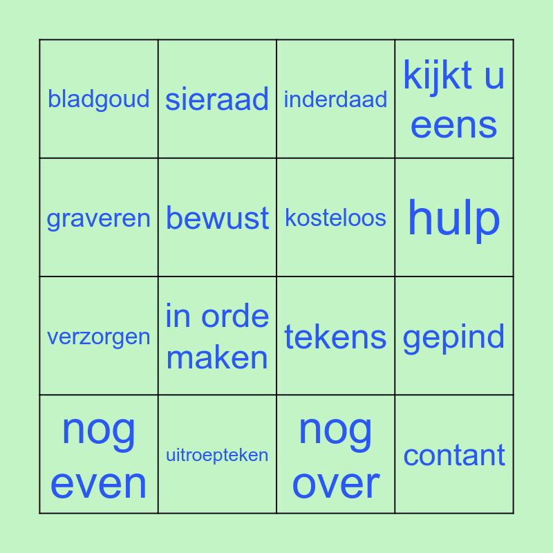 This bingo card has 16 words: uitroepteken, gepind, inderdaad, bladgoud, verzorgen, sieraad, tekens, nog over, graveren, bewust, nog even, kijkt u eens, in orde maken, hulp, kosteloos and contant.