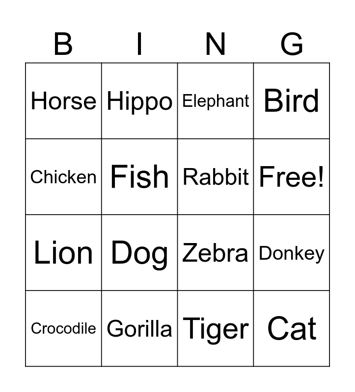This bingo card has 18 words: Dog, Cat, Elephant, Horse, Zebra, Bird, Crocodile, Hippo, Free!, Lion, Tiger, Chicken, Donkey, Fish, Rabbit, Monkey, Gorilla and Snake.
