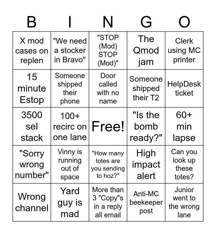 This bingo card has a free space and 24 words: Vinny is running out of space, Yard guy is mad, Door called with no name, Wrong channel, Clerk using MC printer, X mod cases on replen, 15 minute Estop, "We need a stocker in Bravo", "Is the bomb ready?", "How many totes are you sending to hoz?", Someone shipped their T2, 3500 sel stack, High impact alert, Can you look up these totes?, Someone shipped their phone, Anti-MC beekeeper post, 60+ min lapse, "STOP (Mod) STOP (Mod)", HelpDesk ticket, 100+ recirc on one lane, Junior went to the wrong lane, "Sorry wrong number", The Qmod jam and More than 3 "Copy"s in a reply all email.
