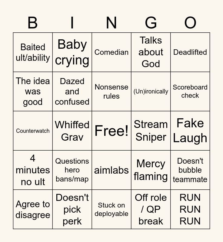 This bingo card has a free space and 51 words: Blames Teammates, RUN RUN RUN, Nothing I could do there, Stuck on deployable, Questions hero bans/map, Really? That was potg?, Baby crying, Rachel jump scare, The idea was good, Baby's Fine, Dazed and confused, Talks about God, Doesn't bubble teammate, Mercy flaming, Blatantly lies, Baby on stream, Nonsense rules, Stream Sniper, It's not a counterswap, Deadlifted, Whiffed Grav, Off role / QP break, Baited ult/ability, (Un)ironically, Objectively, 0 bubbles 0 charge, Scoreboard check, Cheater?, Agree to disagree, Comedian, Smurf, Looks at camera, Detective, Incorrect rank, Merky / Winton, Doesn't pick perk, Game doesn't work, Weird POV VOD, Head scratcher, Chills + Aura, Fake Laugh, 4 minutes no ult, Doesn't contest, Sponsor, Hero Nickname, Learns game mechanic, Counterwatch, 2X Vod, Easy avoid, aimlabs and pickle.