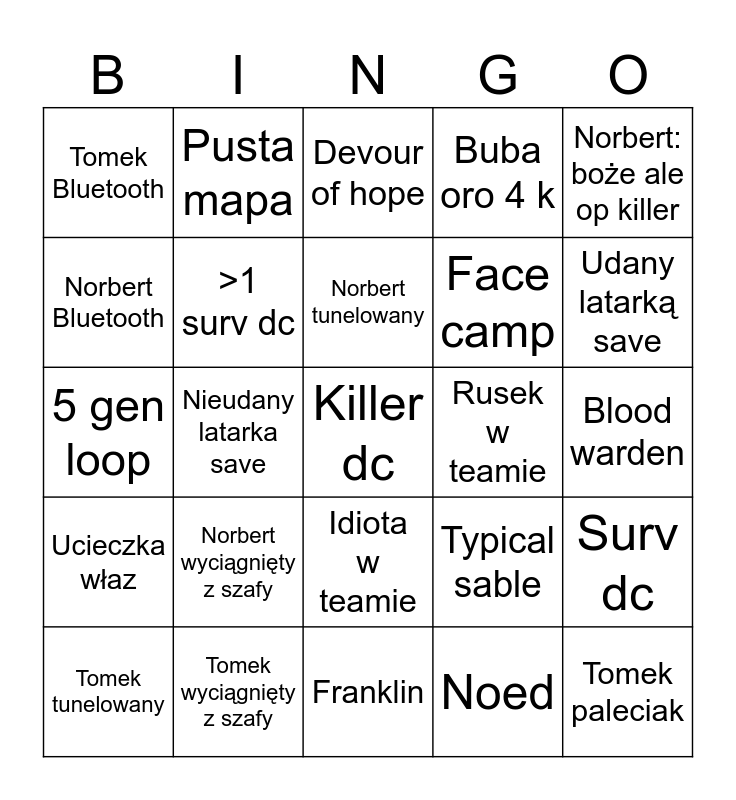 This bingo card has a free space and 24 words: Norbert wyciągnięty z szafy, Tomek wyciągnięty z szafy, Norbert tunelowany, Tomek tunelowany, Norbert: boże ale op killer, Tomek Bluetooth, Norbert Bluetooth, Pusta mapa, Rusek w teamie, Idiota w teamie, Face camp, 5 gen loop, Typical sable, Surv dc, >1 surv dc, Noed, Blood warden, Devour of hope, Udany latarką save, Nieudany latarka save, Tomek paleciak, Ucieczka właz, Buba oro 4 k and Franklin.
