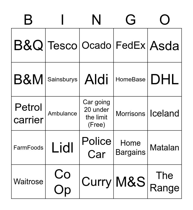 This bingo card has a free space and 24 words: Waitrose, Lidl, Aldi, M&S, Asda, B&Q, Tesco, Ocado, Morrisons, Iceland, Petrol carrier, Sainsburys, Home Bargains, Matalan, B&M, Co Op, Curry, FedEx, DHL, FarmFoods, Ambulance, Police Car, HomeBase and The Range.