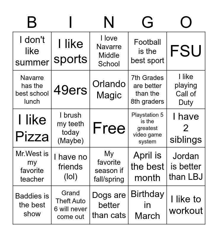 This bingo card has a free space and 34 words: Birthday in April, Birthday in March, Birthday in May, Mr.West is the Best, Mr.West is my favorite teacher, 49ers, FSU, Baddies is the best show, I like sports, Chicken Wings are the best part of the chicken, Orlando Magic, I love Navarre Middle School, Emerald Green is the best color, Science is my favorite subject, Playstation 5 is the greatest video game system, I like playing Call of Duty, Grand Theft Auto 6 will never come out, I like Pizza, I have no friends (lol), April is the best month, My favorite season if fall/spring, I don't like winter, I don't like summer, I have 2 siblings, Dogs are better than cats, I like to workout, Football is the best sport, I can play basketball, 7th Grades are better than the 8th graders, Navarre has the best school lunch, Navarre is the best middle school, I brush my teeth today (Maybe), Jordan is better than LBJ and 33.