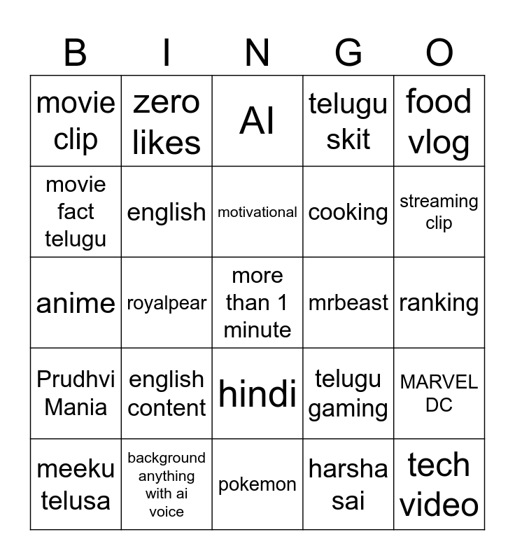 This bingo card has a free space and 24 words: english content, background anything with ai voice, motivational, meeku telusa, food vlog, movie clip, movie fact telugu, zero likes, mrbeast, hindi, cooking, anime, telugu gaming, MARVEL DC, english, harsha sai, ranking, AI, streaming clip, royalpear, tech video, Prudhvi Mania, telugu skit and pokemon.