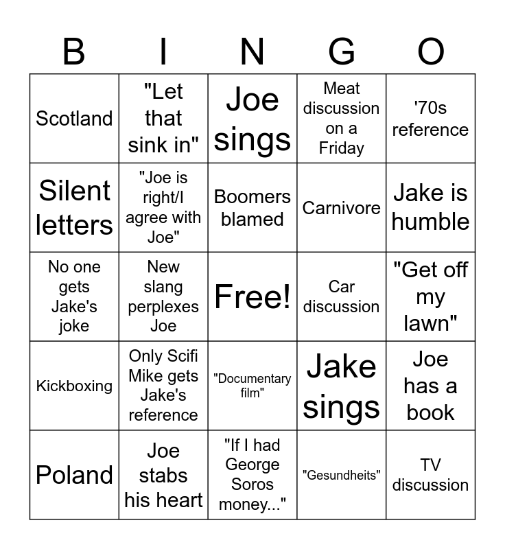 This bingo card has a free space and 56 words: Sugar, Poland, Bavaria, Scotland, "If I had George Soros money...", "When I'm elected Holy Roman Emperor...", "Joe is right/I agree with Joe", "Jake is right/I agree with Jake", Carnivore, War Betwixt the States, Meat discussion on a Friday, Protestant triggers Joe, Jake loses his cool, Terrible pun, Jake Popesplains, '80s reference, '70s reference, New slang perplexes Joe, Movie discussion, TV discussion, Car discussion, Music discussion, Jake sings, Joe sings, Tech problems, Boomers blamed, Joe hates Gen Z, Joe wants to move, Jake is humble, Coffee, Cortes, Wrestling reference, Terrible accent, Terrible impression, "Get off my lawn", Silent letters, No one gets Jake's joke, Miguel Pro canonization, Kickboxing, "Let that sink in", "Documentary film", New Hampshire, Texas reference, The Marines, TeeStorm text wall, Only Scifi Mike gets Jake's reference, Joe stabs his heart, "Mea culpa", Impromptu Bible study, History rant, "Gesundheits", Uncanonized saint, ora pro nobis, Classic film reference, Jake is a liturgy nerd, Joe has a book and Joe extols the virtues of Sarcasm.