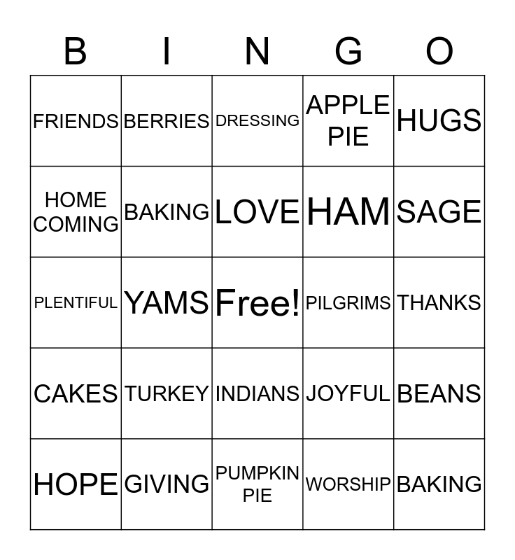 This bingo card has a free space and 24 words: TURKEY, GIVING, LOVE, HOPE, HUGS, FRIENDS, HOME COMING, BERRIES, PILGRIMS, INDIANS, HAM, PLENTIFUL, JOYFUL, BEANS, BAKING, WORSHIP, THANKS, DRESSING, SAGE, YAMS, BAKING, CAKES, APPLE PIE and PUMPKIN PIE.