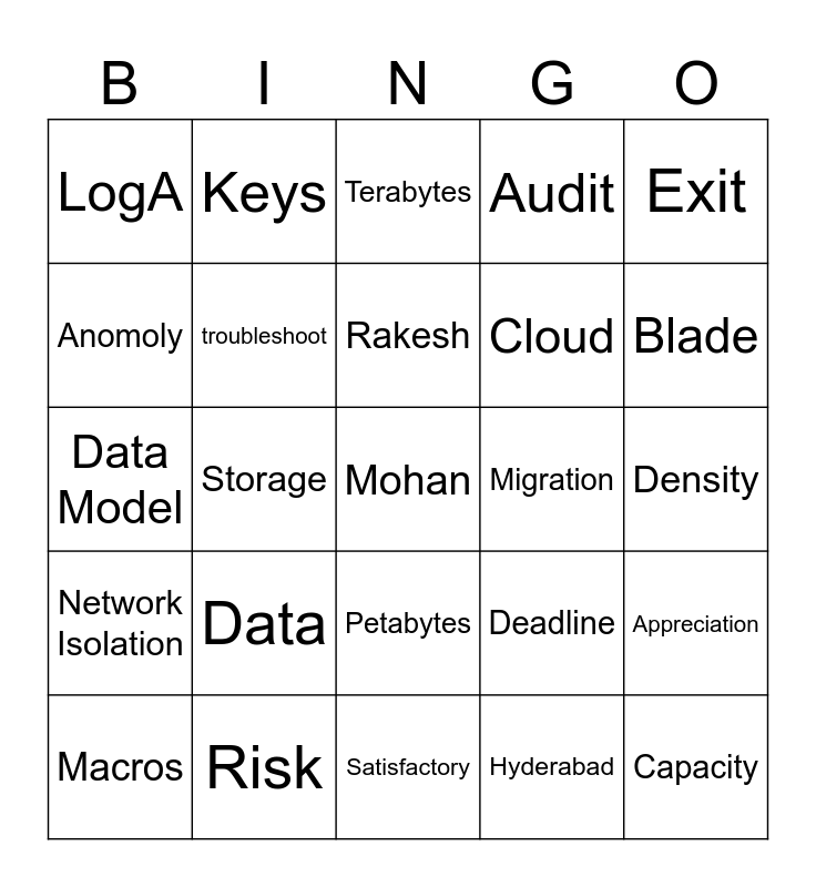 This bingo card has 50 words: Rack, Mohan, Rohit, Satisfactory, Data, Scorecard, Keys, Cyclotron, Anomoly, Dheeraj, troubleshoot, Audit, Appreciation, Deadline, Rishika, Patrick, Rakesh, Migration, Wins, Exit, Storage, Hyderabad, LogA, Cloud, Benefits, Capacity, Blade, Autoscaling, Terabytes, Petabytes, Business, Decommission, Virtual, Physical, Risk, Encryption, NVMe, performance, Pure, Density, Power, Rotation, Observability, Consumer, Macros, Data Model, Adoption, ESD, Network Isolation and Rebalancing.