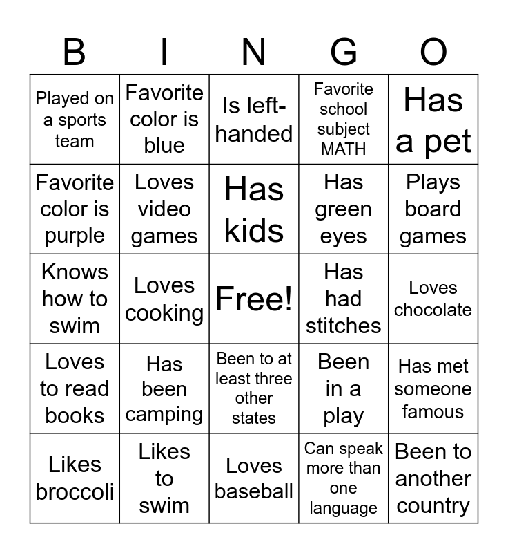 This bingo card has a free space and 54 words: Favorite food is Pizza, Loves to read books, Likes to dance, Has siblings, Been to at least three other states, Likes country music, Favorite school subject MATH, Has a summer birthday, Favorite color is purple, Likes to be outside, Played on a sports team, Favorite season WINTER, Likes to swim, Likes broccoli, Watches Disney Channel, Loves baseball, Been to another country, Has green eyes, Had a broken bone, Loves chocolate, Been in a play, Afraid of spiders, Has had stitches, Has a pet, Plays a musical instrument, Favorite color is blue, Plays a sport, Can whistle loudly, Has the same favorite subject as you, Can speak more than one language, Has broken a bone, Favorite holiday is Halloween, Has been on a plane, Prefers cats over dogs, Is left-handed, Loves spicy food, Knows how to swim, Has met someone famous, Favorite season is winter, Loves video games, Has the same favorite snack as you, Doesn’t like chocolate, Has a TikTok account, Can draw really well, Has been camping, Loves coffee, Speaks another language, Has run a marathon (or 5k, etc.), Has kids, Loves cooking, Plays board games, Plays an instrument, Doesn’t drink coffee and Loves gardening.