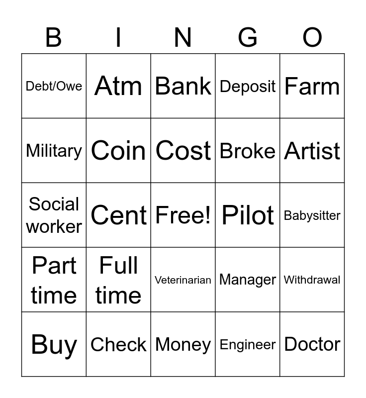 This bingo card has a free space and 30 words: Check, Dollar, Cent, Credit card, Debt/Owe, Bank, Coin, Veterinarian, Pilot, Money, Babysitter, Doctor, Engineer, Dentist, Artist, Boss, Manager, Part time, Full time, Farm, Social worker, Scientist, Atm, Broke, Military, Deposit, Withdrawal, Buy, Cost and Earn.