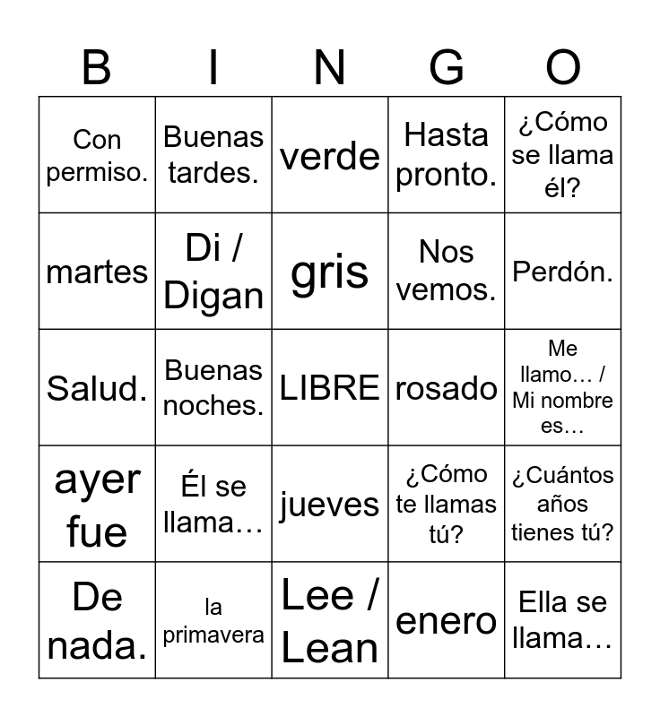 This bingo card has a free space and 72 words: Buenos días., Buenas tardes., Buenas noches., Buen día., Chau., Hasta mañana., Hasta pronto., Hasta luego., Nos vemos., Muchas gracias., De nada., por favor, Perdón., Con permiso., Lo siento., Salud., ¿Cómo te llamas tú?, ¿Cómo se llama él?, ¿Cómo se llama ella?, Me llamo… / Mi nombre es…, Él se llama…, Ella se llama…, ¿Cuántos años tienes tú?, ¿Cuándo es tu cumpleaños?, Mucho gusto., El gusto es mío., Encantado/a., la estación, el año, el invierno, la primavera, el verano, el otoño, el mes, enero, el día, la semana, lunes, martes, miércoles, jueves, viernes, sábado, domingo, fin de semana, ayer fue, hoy es, mañana será, amarillo, anaranjado, blanco, negro, morado, rosado, rojo, marrón, verde, gris, azul, ¿Cuál es tu color favorito?, los mandatos, Escribe / Escriban, Contesta / Contesten, Lee / Lean, Escucha / Escuchen, Repite / Repitan, Di / Digan, Pon / Pongan, Guarda / Guarden, Haz / Hagan, Ven / Vengan and Saca / Saquen.