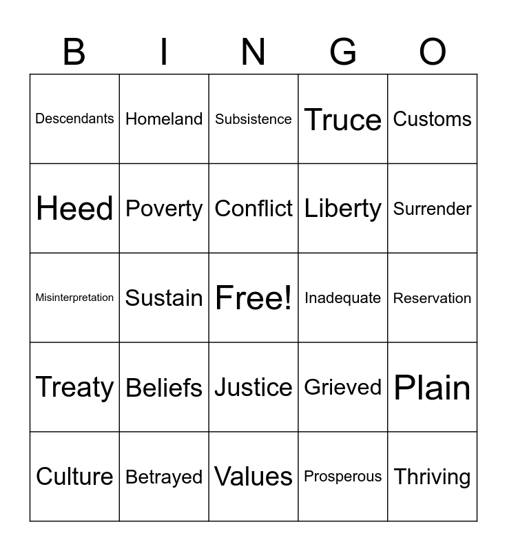This bingo card has a free space and 24 words: Beliefs, Betrayed, Conflict, Culture, Customs, Descendants, Heed, Homeland, Inadequate, Justice, Liberty, Misinterpretation, Grieved, Plain, Poverty, Prosperous, Reservation, Subsistence, Surrender, Sustain, Thriving, Treaty, Truce and Values.