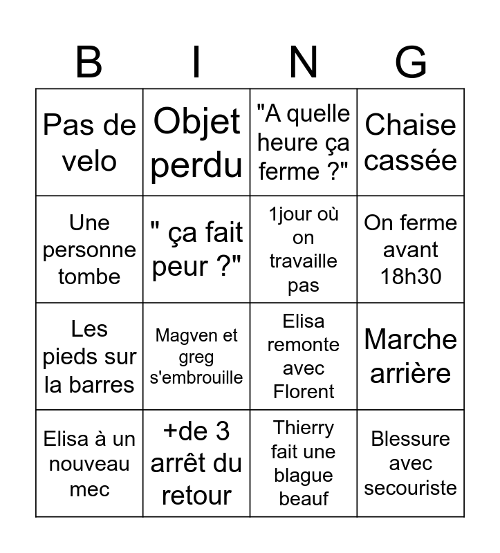 This bingo card has 16 words: +de 3 arrêt du retour, Marche arrière, "A quelle heure ça ferme ?", Pas de velo, Les pieds sur la barres, Objet perdu, Elisa remonte avec Florent, Thierry fait une blague beauf, Une personne tombe, " ça fait peur ?", Elisa à un nouveau mec, Chaise cassée, Magven et greg s'embrouille, On ferme avant 18h30, 1jour où on travaille pas and Blessure avec secouriste.